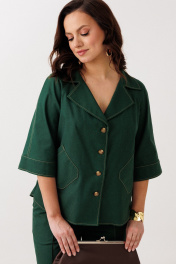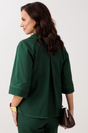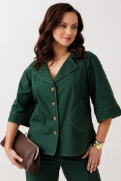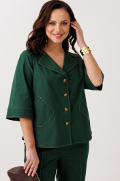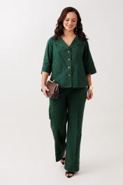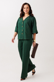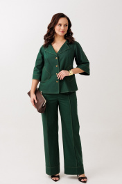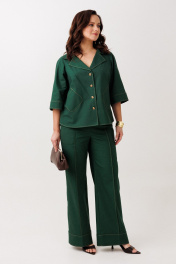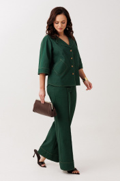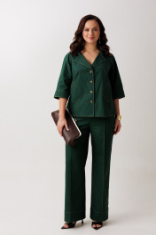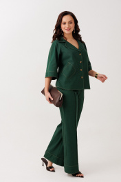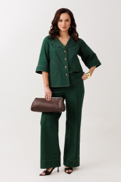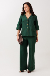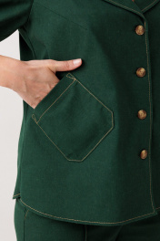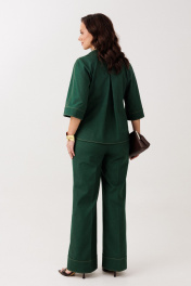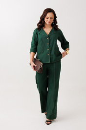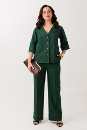 Костюм женский, состоящий из жакета и брюк, выполненный из костюмной ткани (немного тянется) с контрастными отделочными строчками. Жакет прямого силуэта без подкладки. По переду нагрудные вытачки, накладные карманы, центральная застежка на петли-пуговицы. По спинке встречная складка, застроченная до уровня лопаток. Горловина оформлена воротником пиджачного типа с лацканом. Рукава покроя реглан с притачными манжетами. Брюки прямого, свободного кроя с высокой посадкой, с наклонными карманами в боковых швах. По срезу банта застежка-молния. По передним половинкам вертикальная застроченная складка по 0,5см. По низу брюк отрезные манжеты. Верхний срез оформлен поясом с резинкой по задней половинке.