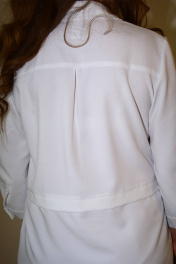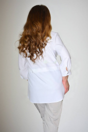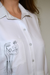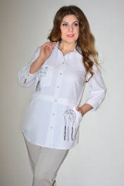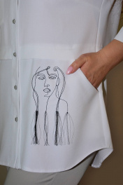 Блузка, привлекающая внимание, из однотонной смешанной ткани. Модель впечатляет своей непринужденной элегантностью, поэтому хороша будет на каждый день. Блузка прямого силуэта, с втачным покроем рукава, с центральной застежкой на петли-пуговицы, с подрезом ниже линии талии, вдоль нижнего среза которого заложена глубокая складка. Перед с нагрудной вытачкой, идущей от бокового шва, с накладным нагрудным карманом, с отрезной планкой под застежку, на которой обработаны 8 петель и 8 пуговиц, по нижней детали переда обработан боковой карман с отрезным бочком. По накладному карману и нижней левой детали переда расположена д изайнерская вышивка с художественным изображением лица . Спинка с кокеткой, в шве притачивания которой обработана бантовая складка. Низ изделия с закруглениями к боковому шву. Рукава втачные одношовные, длиной 3/4, с притачной манжетой по низу, концы которой застёгиваются на одну обмётанную петлю и пуговицу, по шву притачивания манжеты расположена односторонняя складка. По горловине обработан отложной воротник с отрезной стойкой. Блузка п одходит на любую фигуру и выглядит одинаково стильно и великолепно в любом размере.