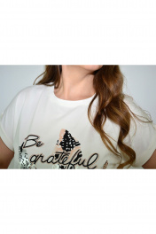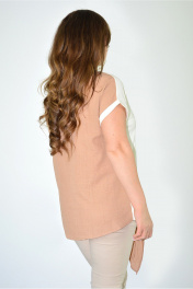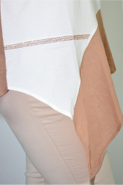 Блузка женская, состоящая из двух видов материалов: — мягкое эластичное трикотажное однотонное полотно, в состав которого входит хлопок; — ткань смешанная однотонная с текстурой «лён». Блузка повседневная, прямого силуэта, со спущенным рукавом. Перед асимметричный, с трафаретной печатью, по которой нанесены термостразы, по низу с подрезом, шов которого украшен аппликацией из термостраз, с отрезным воланом. Спинка цельная. Низ изделия фигурный . Низ рукавом обработан притачной манжетой, которая подвернута и закреплена. По горловине обработана бейка. Длина изделия по спинке — 74 см, длина рукава от горловины — 27 см.