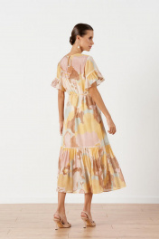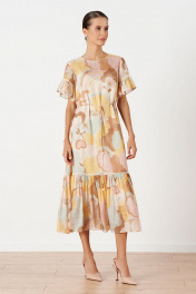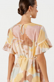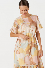 Летящее платье свободного силуэта с воланами от бренда NELVA, выполненное из принтованного полотна «Закатная абстракция», погружает в атмосферу лета и идеально подходит для городских прогулок, романтических вечеров. Хлопок в составе обеспечивает комфорт даже в самые жаркие дни. Просто добавьте открытую обувь, и Вы готовы к приключениям. Округлый вырез горловины мягко подчеркивает линию шеи. Короткие рукава, декорированы воланом, придают воздушность и романтичность. Фигурный вырез по спинке с застежкой на петлю и пуговицу нежно завершает образ. Дополняется тонким поясом-лентой с наконечниками и бусинами: подчеркивает талию и добавляет изящества. Это платье станет отличным выбором для уверенных в себе женщин, желающих выделяться среди остальных своей непревзойденностью и вкусом. С любовью и заботой о Вас, команда бренда NELVA! *Платье без подкладки предлагается комбинировать с платьем-комбинацией на тонких бретелях, которое можно приобрести отдельно.