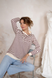 Худи женский их хлопкового трикотажного полотна "трехнитки" прямого силуэта с воротником типа "хомут". Рукава длинные, втачные с манжетой. Низ худи также обработан притачной деталью, как у манжета рукавов. Воротник притачной асимметричный с завязками. Худи с украшен принтом в виде звездочек. Размеры от 42 по 52. Ткань приятная для прогулок, занятия спортом. Худи сочетается с брюками, джинсами, юбками.