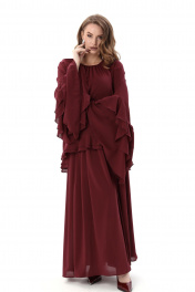 Блуза свободного силуэта с присборенной горловиной, обработанной бейкой. Спинка со средним швом, переходящим в разрез. Рукава реглан с асимметричными воланами. Нижний край блузы с двойным воланом.