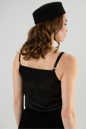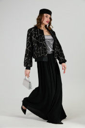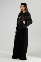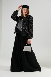 Костюм трехпредметный: состоит из джемпера, брюк и топа. Джемпер прямого силуэта на подкладке. Рукав втачной. По переду карманы, застёжка на тесьму-молнию. Воротник прилегающий. Длина рукава 60 см, длина изделия 56 см. Топ на тонких регулируемых бретелях. Брюки-юбка свободного кроя из трикотажного гофре, верхний срез представлен широкой резинкой.