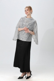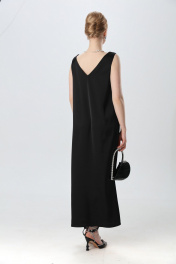 Костюм двухпредметный: состоит из джемпера и платья. Элегантный джемпер-кейп прямого свободного силуэта с спайетками. Горловина с цельнокроеным воротником-стойкой. Рукав втачной широкий, от линии локтя до запястья есть дополнительное отверстие для рук. Платье прямого силуэта, с небольшим расширением к низу, длиной макси. Перед с нагрудной вытачкой из бокового шва. Вырез горловины переда и спинки имеют V-образную форму.