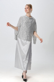 Костюм двухпредметный: состоит из джемпера и платья. Элегантный джемпер-кейп прямого свободного силуэта с спайетками. Горловина с цельнокроеным воротником-стойкой. Рукав втачной широкий, от линии локтя до запястья есть дополнительное отверстие для рук. Платье прямого силуэта, с небольшим расширением к низу, длиной макси. Перед с нагрудной вытачкой из бокового шва. Вырез горловины переда и спинки имеют V-образную форму.