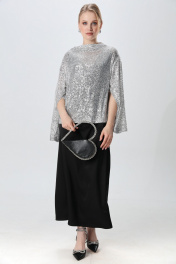 Платье прямого силуэта, с небольшим расширением к низу, длиной макси. Перед с нагрудной вытачкой из бокового шва. Вырез горловины переда и спинки имеют V-образную форму.