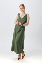 Платье прямого силуэта, с небольшим расширением к низу, длиной макси. Перед с нагрудной вытачкой из бокового шва. Вырез горловины переда и спинки имеют V-образную форму.