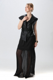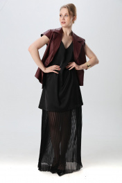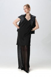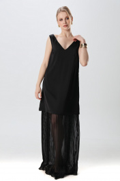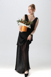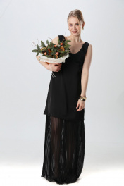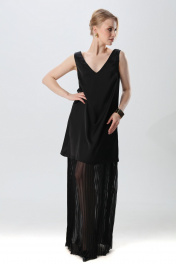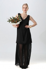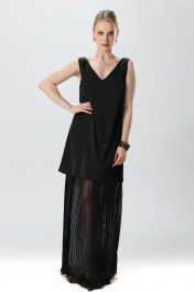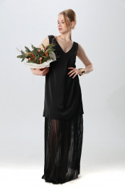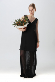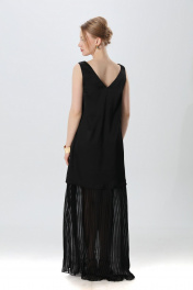 Платье прямого силуэта, с небольшим расширением к низу, длиной макси. Перед с нагрудной вытачкой из бокового шва. Вырез горловины переда и спинки имеют V-образную форму. Низ платья декорирован воланом из гофрированного шифона.