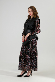 Костюм двухпредметный: состоит из платья и жилета. Платье макси прямого силуэта с округлым вырезом, отрезное по линии талии. Рукав немного приспущен, нижний край рукавов оформлен резинкой. Изделие на подкладке. Жилет удлиненный прямого свободного силуэта, воротник пиджачного типа. Линия низа по переду и спинке фигурная ассиметричная. Короткий рукав-крылышко. Талия фиксируется съемным ремнем из экокожи, для которого в боковых швах оформлены шлевки. Ремень идёт в комплекте к изделию.