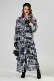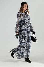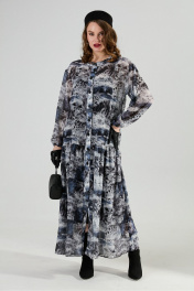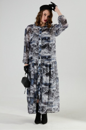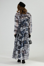 Костюм трехпредметный: состоит из верхнего и нижнего платьев, жилета. Верхнее платье макси свободного кроя прямого силуэта. Центральная застежка на петли и пуговицы. Спинка присборена в верхней части, с притачной кокеткой. Горловина оформлена воротником-стойкой. Объемный втачной рукав со спущенной проймой, присбореный по окату. По низу платья широкая отрезная оборка с густой сборкой. Нижнее платье-комбинация на регулируемых бретелях. Жилет удлиненный свободного прямого силуэта, воротник пиджачного типа. Линия низа по переду и спинке фигурная ассиметричная. Короткий рукав-крылышко. Талия фиксируется съемным ремнем из экокожи, для которого в боковых швах оформлены шлевки. Ремень идёт в комплекте к изделию.