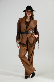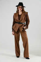 Жилет удлиненный свободного прямого силуэта, воротник пиджачного типа. Линия низа по переду и спинке фигурная ассиметричная. Короткий рукав-крылышко. Талия фиксируется съемным ремнем из экокожи, для которого в боковых швах оформлены шлевки. Ремень идёт в комплекте к изделию.
