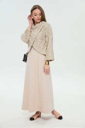 Костюм двухпредметный: состоит из джемпера-кейпа и платья. Укороченный джемпер-кейп с округлой горловиной и фигурным лифом. Рукав втачной широкий , от линии локтя до запястья есть дополнительное отверстие для рук. Платье длиной миди отрезное по линии талии приталенного силуэта. Нижняя часть платья имеет небольшое расклешение.Прилегание по переду создано за счет нагрудных вытачек, переведенных в боковой шов, и талиевых вытачек. На спинке талиевые вытачки и средний шов. Застежка платья на потайную молнию в среднем шве спинки. Плечевой пояс оформлен кокетками по переду и спинке, напоминающими по форме рукав реглан. Плечо немного приспущено.