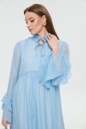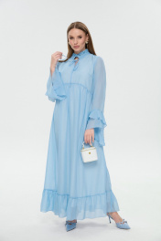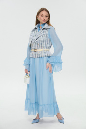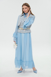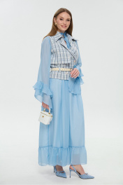 Костюм двухпредметный: состоит из платья и жилета. Платье макси свободного кроя с завышенной фигурной линией талии. Горловина оформлена воротником-стойкой с завязками, верхний край украшен рюшей. Рукав втачной широкий с асимметричными воланами по низу. Изделие на подкладке. Низ юбки оформлен воланом. Жилет двубортный с отложным воротником на отрезной стойке, умеренного объема, прямого силуэта с застежкой на петли и пуговицы. Талия фиксируется съемным ремнем из экокожи, для которого в боковых швах оформлены шлевки. Ремень идёт в комплекте к изделию. Декоративные элементы