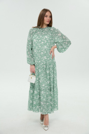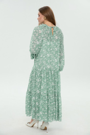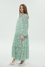 Костюм трёхпредметный: состоит из жилета, платья верхнего и нижнего. Платье состоит из двух платьев: верхнего и нижнего. Верхнее платье в пол свободного силуэта отрезное по линии бёдер. Перед лифа имеет расширение по низу. Горловина лифа собрана на сборку, оформлена вырезом по среднему шву и окантована бейкой, переходящей в завязки. Перед лифа цельный, имеет расширение по низу. Юбка платья имеет два яруса, которые собраны на сборку. Рукав объемный, одношовный. Низ рукава собран на сборку. Нижнее платье-комбинация на регулируемых бретелях. Жилет прямого силуэта с воротником пиджачного типа. По правой пройме переда расположена фигурная деталь "крылышко". Спинка со средним швом. По низу правого переда и низу правой спинки фигурная деталь. По левой части переда и левой части спинки отлетная кокетка. Изделие идёт в комплекте с ремнем из экокожи.