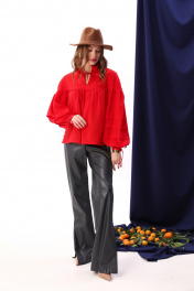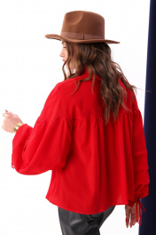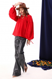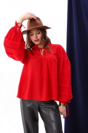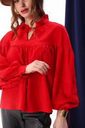 Изящная блуза свободного кроя. Полочка и спинка с отрезными кокетками, переходящими на верхнюю часть рукава. Кокетка полочки с разрезом и завязками у горловины. Горловина оформлена воротником-стойкой, верхний край украшен рюшей. По шву притачивания кокетка к полочке, спинке и рукавам выполнена сборка. Рукав длинный, одношовный, с поперечными рельефными декоративными швами. Нижний край рукавов оформлен манжетами с завязками.