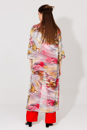 Костюм трехпредметный: состоит из топа, кардигана и брюк.Кардиган прямого кроя с акцентным принтом. Горловина обработана рубашечным воротником с отрезной стойкой. Модель со слегка приспущенной линией плеча и рукавами длиной 7/8. Застёжка центральная на петли и пуговицы. По низу изделия разрезы. Топ на регулируемых бретелях с полукруглым вырезом. Брюки прямого кроя, с карманами.По переду боковой карман, застежка на тесьму-молнию и пуговицу. По спинке верхний срез представлен резинкой.