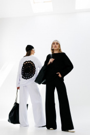 Костюм двухпредметный: состоит из джемпера и брюк. Джемпер свободного силуэта с округлой горловиной. Рукав комбинированного кроя, с передними и задними швами. Верхняя и нижняя часть рукава образуют между собой разрез. По спинке изделие декорировано авторским вязаным элементом ручной работы. Брюки свободного кроя, верхний срез представлен широкой резинкой, с карманами.