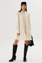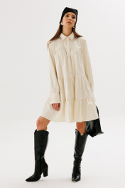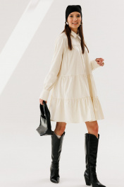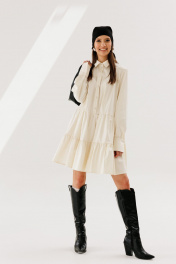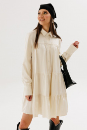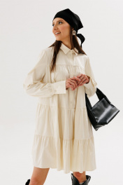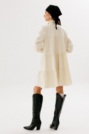 Воздушное платье трапециевидного силуэта отрезное ниже линии талии. Застежка центральная с отрезными планками на петли и пуговицы. Перед и спинка с притачными кокетками. Верхние срезы переда и спинки по линии соединены с кокеткой и собраны на сборку. Рукав втачной, одношовный. Нижний срез рукава со сборкой и разрезом, обработан притачной манжетой. Разрез рукава обработан обтачкой.
