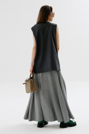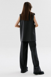Жилет назапах с полукруглым вырезом. Застёжка на петли и пуговицы на уровне плечевого шва.