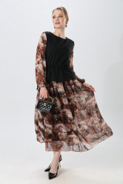Платье макси комбинированное, двухцветное. Лиф выполнен из трикотажной ткани, от низа переда заложена складка, проходящая через плечевой шов до низа спинки. По линии талии с двух сторон настрочены кулисы с двух сторон со шнурком. Вырез горловины полукруглый. Рукава втачные, собраны на резинку. Юбка на резинке, драпирующаяся, расширенного силуэта.