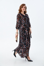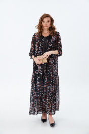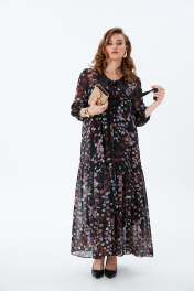 Платье состоит из двух платьев: нижнего и верхнего. Верхнее платье макси прямого свободного силуэта с воланом по низу изделия. Рукав втачной с притачным манжетом. Горловина обработана плосколежащим воротником из отделочной ткани фигурной формы. Центральная застёжка на петли и пуговицы. Нижнее платье комбинация на регулируемых бретелях.