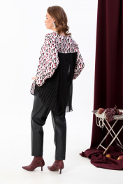 Блуза свободного кроя с округлым вырезом горловины. Центральная застёжка на петли и пуговицы. Рукав втачной одношовный спущенный с притачной манжетой на петлю и пуговицу. Спинка с отрезной кокеткой, нижняя часть спинки декорирована плиссированным шифоном. Низ изделия фигурный. Боковые швы с разрезами.
