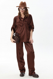 Жакет рубашечного типа прямого силуэта с асимметричным низом. Рукав втачной со спущенной линией плеча, фиксируется на пату. Застежка центральная на петли и пуговицы, смещённая по косой. На левой полочке накладной карман с клапаном. Воротник отложной на стойке до половины спинки.