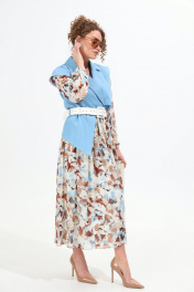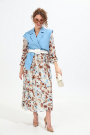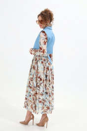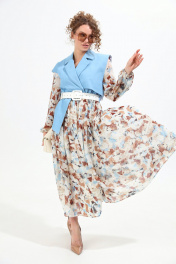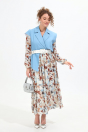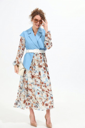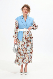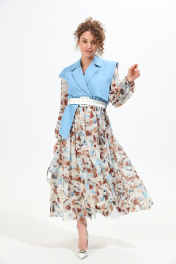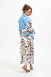 Платье комбинированное, состоящее из основной ткани и отделочной. Имитация верхнего жилета из денима прямого силуэта с воротником пиджачного типа. По правой пройме переда расположена фигурная деталь "крылышко". Спинка со средним швом. По низу правого переда и низу правой спинки фигурная деталь. По левой части переда и левой части спинки отлетная кокетка. Рукава одношовные, втачные, длинные со сборкой по линии низа на резинку из отделочной ткани. Юбка прямого силуэта длинная, со сборкой по талии из отделочной ткани. По линии талии платья резинка и шлевки по боковым швам и центральному шву спинки из основной ткани. В комплект к платью идёт ремень с пряжкой.