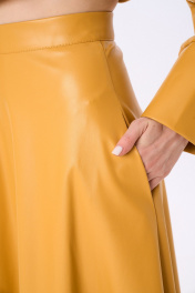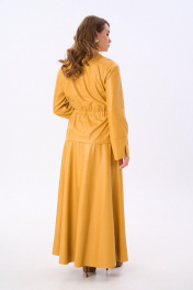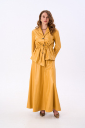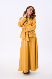 Костюм двухпредметный: состоит из жакета и юбки. Жакет прямого силуэта, воротник пиджачного типа, рукав одношовный, втачной с незначительно спущенной линией плеча, длинный, с притачной манжетой, декорированной разрезом. По линии ткани настрачная кулиса с завязками из основной ткани. Застежка центрально-бортовая. Линия низа верхней части фигурная ассиметричная. Юбка - солнце макси с узким поясом. В боковых швах расположены карманы. Застёжка на петлю и пуговицу и молнию по спинке.