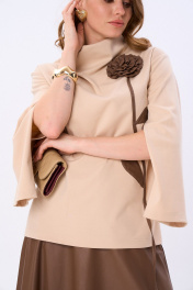 Джемпер-кейп прямого свободного силуэта. Горловина с цельнокроеным воротником-стойкой. Рукав втачной широкий, от линии локтя до запястья есть дополнительное отверстие для рук. Декорирован цветком из контрастной ткани.