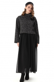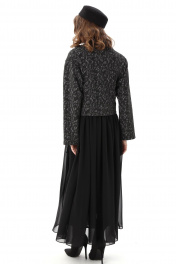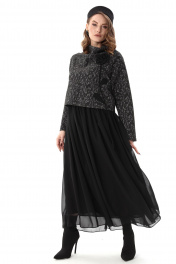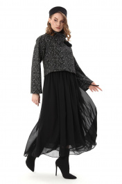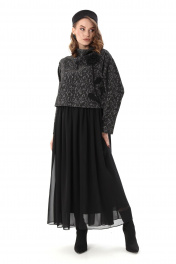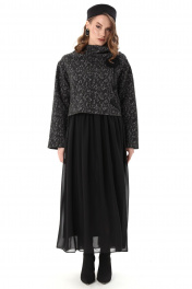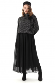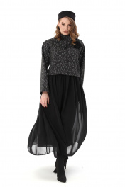 Платье прямого силуэта, состоящее из комбинации двух тканей - основной и отделочной. Воротник цельнокроеный хомут. Рукав одношовный, втачной, длинный. Нижняя юбка из отделочной ткани, со сборкой по линии талии. В виде отделки по левой части переда декоративный элемент из отделочной ткани. Юбка на подкладке.