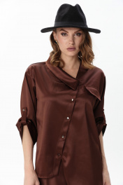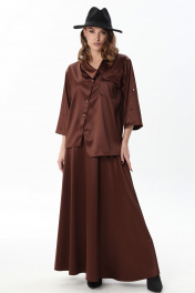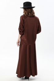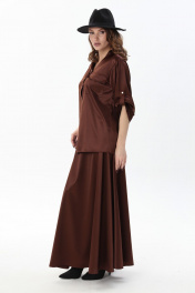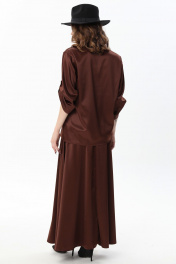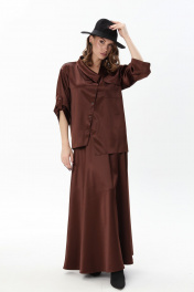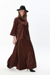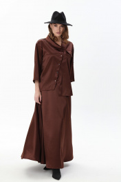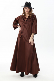 Костюм комбинированный двухпредметный: состоит из жакета и юбки. Жакет рубашечного типа прямого силуэта с асимметричным низом. Рукав втачной со спущенной линией плеча, фиксируется на пату. Застежка центральная на петли и пуговицы, смещённая по косой. На левой полочке накладной карман с клапаном. Воротник отложной на стойке до половины спинки. Юбка - солнце макси с узким поясом. В боковых швах расположены карманы. Застёжка на петлю и пуговицу и молнию по спинке.