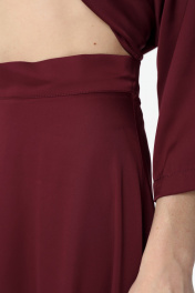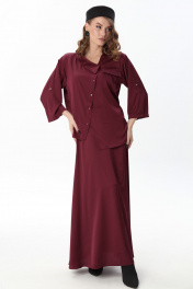 Костюм комбинированный двухпредметный: состоит из жакета и юбки. Жакет рубашечного типа прямого силуэта с асимметричным низом. Рукав втачной со спущенной линией плеча, фиксируется на пату. Застежка центральная на петли и пуговицы, смещённая по косой. На левой полочке накладной карман с клапаном. Воротник отложной на стойке до половины спинки. Юбка - солнце макси с узким поясом. В боковых швах расположены карманы. Застёжка на петлю и пуговицу и молнию по спинке.