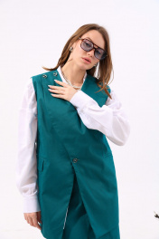 Костюм двухпредметный: состоит из жилета и юбки. Жилет прямого силуэта оверсайз. По переду талиевая вытачка переходящая в прорезной карман с клапаном и двумя обтачками. Спинка цельнокроенная. Перед фигурный симметричный с застежкой на правом плече на петли и пуговицы. Для дополнительной фиксации по центру застежка на одну петлю и пуговицу. Юбка прилегающего силуэта, зауженная к низу, длиной ниже колена с высоким разрезом по центру и застежкой на тесьму- молнию. Переднее полотнище юбки с рельефами, наклонно к которым расположены карманы.