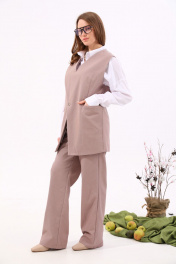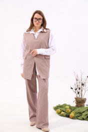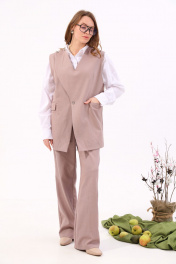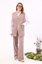 Костюм двухпредметный: состоит из жилета и брюк. Жилет прямого силуэта оверсайз. По переду талиевая вытачка переходящая в прорезной карман с клапаном и двумя обтачками. Спинка цельнокроенная. Перед фигурный симметричный с застежкой на правом плече на петли и пуговицы. Для дополнительной фиксации по центру застежка на одну петлю и пуговицу. Прямые брюки с двойным поясом из отделочной контрастной ткани. Изделие по линии талии на резинке с имитацией гульфика. Карманы с отрезным бочком.