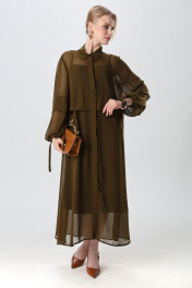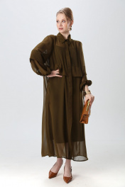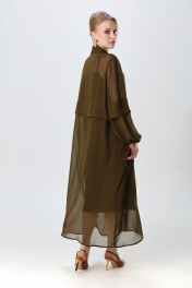Платье состоит из двух платьев: нижнего и верхнего. Верхнее платье макси с центральной отрезной застёжкой на потайную планку на петли и пуговицы.По переду и спинке цельнокроеные складки на уровне талии. Рукав втачной,одношовный рубашечноно типа. По низу рукава пробиты петли и вставлена завязка для фиксации сборки . Воротник рубашечный стояче отложной. Нижнее платье комбинация на регулируемых бретелях.
