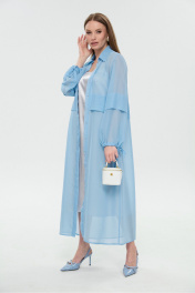 Платье-кардиган из шифона с центральной отрезной застёжкой на потайную планку на петли и пуговицы.По переду и спинке цельнокроеные складки на уровне талии. Рукав втачной,одношовный рубашечноно типа. По низу рукава пробиты петли и вставлена завязка для фиксации сборки . Воротник рубашечный стояче отложной.