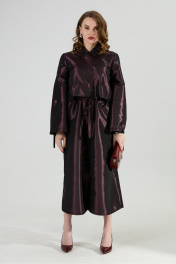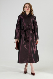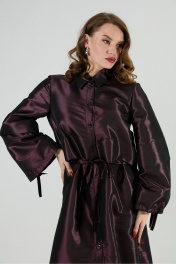 Платье макси с центральной отрезной застёжкой на центральную застежку на петли и пуговицы.По переду и спинке цельнокроеные складки на уровне талии. Рукав втачной,одношовный рубашечного типа. По низу рукава пробиты петли и вставлена завязка для фиксации сборки . Воротник рубашечный стояче отложной. В комплект идёт пояс из основной ткани.