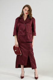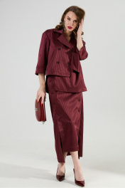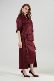Юбка длиной миди, расклешенная к низу, с асимметричным низом. Пояс притачной, по спинке собран на резинку. Переднее полотнище состоит из трех частей. Правая часть скреплена отделочной строчкой и кнопками. В боковых швах изделия расположены карманы. По спинке изделия идёт средний шов и две вытачки для удачной посадки по фигуре. Юбка без подкладки.