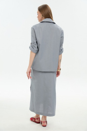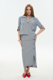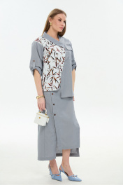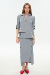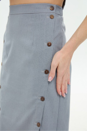 Юбка длиной миди, расклешенная к низу, с асимметричным низом. Пояс притачной, по спинке собран на резинку. Переднее полотнище состоит из трех частей. Правая часть скреплена отделочной строчкой и кнопками. В боковых швах изделия расположены карманы. По спинке изделия идёт средний шов и две вытачки для удачной посадки по фигуре. Юбка без подкладки.