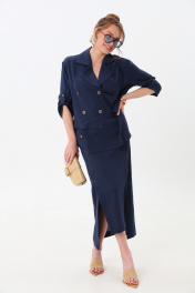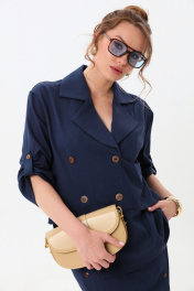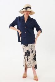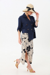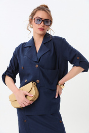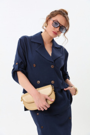 Жакет прямого силуэта с имитацией центральной застёжки на пуговицы. Рукав втачной одношовный, длиной три четверти,застегивающийся на пату. Воротник пиджачного типа . Линия низа фигурная, симметричная . По левому переду расположена декоративная деталь.