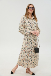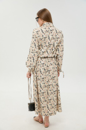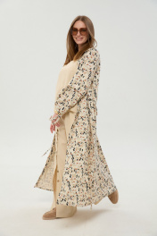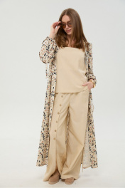 Костюм трехпредметный: состоит из кардигана-платья, брюк и топа. Платье-кардиган макси с центральной отрезной застёжкой на потайную планку на петли и пуговицы.По переду и спинке цельнокроеные складки на уровне талии. Рукав втачной,одношовный рубашечноно типа. По низу рукава пробиты петли и вставлена завязка для фиксации сборки . Воротник рубашечный стояче отложной. В комплект к изделию идёт пояс из основной ткани для максимально комфортного регулирования объёма. Брюки свободного кроя, верхний срез представлен широкой резинкой, с карманами. По центру правой брючины расположена планка с функционирующими петлями и пуговицами. Топ на тонких регулируемых бретелях.