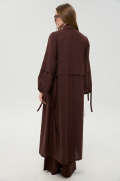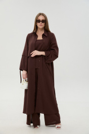 Костюм трехпредметный: состоит из кардигана-платья, брюк и топа. Платье-кардиган макси с центральной отрезной застёжкой на потайную планку на петли и пуговицы.По переду и спинке цельнокроеные складки на уровне талии. Рукав втачной,одношовный рубашечноно типа. По низу рукава пробиты петли и вставлена завязка для фиксации сборки . Воротник рубашечный стояче отложной. В комплект к изделию идёт пояс из основной ткани для максимально комфортного регулирования объёма. Брюки свободного кроя, верхний срез представлен широкой резинкой, с карманами. По центру правой брючины расположена планка с функционирующими петлями и пуговицами. Топ на тонких регулируемых бретелях.