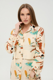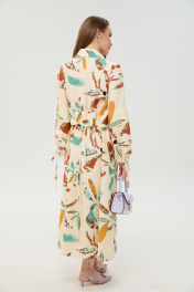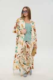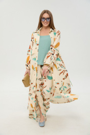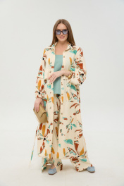 Костюм трехпредметный: состоит из кардигана-платья, брюк и топа. Платье-кардиган макси с центральной отрезной застёжкой на потайную планку на петли и пуговицы.По переду и спинке цельнокроеные складки на уровне талии. Рукав втачной,одношовный рубашечноно типа. По низу рукава пробиты петли и вставлена завязка для фиксации сборки . Воротник рубашечный стояче отложной. В комплект к изделию идёт пояс из основной ткани для максимально комфортного регулирования объёма. Брюки свободного кроя, верхний срез представлен широкой резинкой, с карманами. По центру правой брючины расположена планка с функционирующими петлями и пуговицами. Топ на тонких регулируемых бретелях.