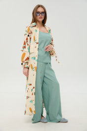 Костюм трехпредметный: состоит из кардигана-платья, брюк и топа. Платье-кардиган макси с центральной отрезной застёжкой на потайную планку на петли и пуговицы.По переду и спинке цельнокроеные складки на уровне талии. Рукав втачной,одношовный рубашечноно типа. По низу рукава пробиты петли и вставлена завязка для фиксации сборки . Воротник рубашечный стояче отложной. В комплект к изделию идёт пояс из основной ткани для максимально комфортного регулирования объёма. Брюки свободного кроя, верхний срез представлен широкой резинкой, с карманами. По центру правой брючины расположена планка с функционирующими петлями и пуговицами. Топ на тонких регулируемых бретелях.
