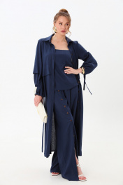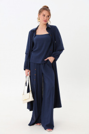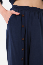 Брюки свободного кроя, верхний срез представлен широкой резинкой, с карманами. По центру правой брючины расположена планка с функционирующими петлями и пуговицами.