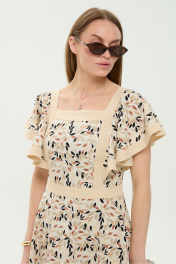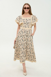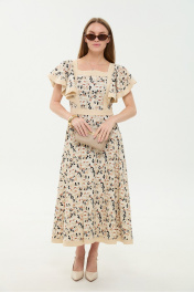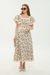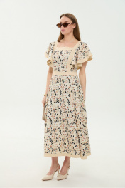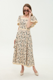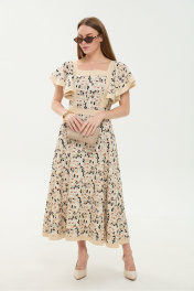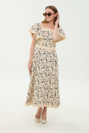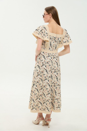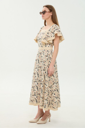 Платье прилегающего силуэта отрезное по линии талии с расклешенной юбкой. Линия горловины фигурная, обработанная широкими вставками из отделочной ткани. По переду и спинке по рельефам вставлены крылышки и настрочены вставки из отделочной ткани. Пояс отрезной из отделочной ткани. Юбка состоит из двух частей. Верхняя и нижняя части юбки скреплены вставкой из отделочной детали. Изделие с потайной застёжкой на молнию по спинке.