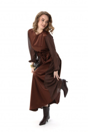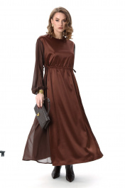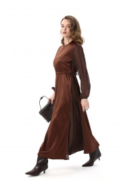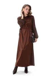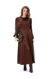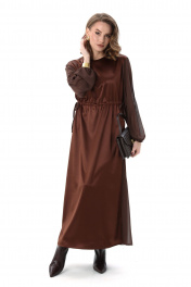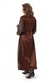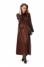 Платье длиной макси комбинированное, свободного кроя, расклешенное к низу. Перед состоит из центральной и боковой части. Спинка с притачной кокеткой, центральной и боковыми частями. На переде и спинке по линии талии настрочена кулиска, с регулировкой прилегания с помощью шнура. Рукав втачной длинный. Горловина изделия круглой формы.