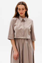 Комфортное платье, состоящее из лифа и юбки, имитирующее костюм-двойку. Лиф прямого кроя с втачным рукавом три четверти. Горловина обработана рубашечным воротником с отрезной стойкой. Застёжка центральная на пуговицы. По талии собрано на резинку. Юбка А-силуэта.
