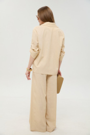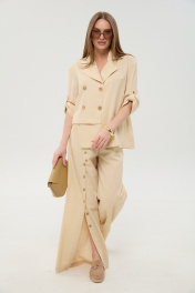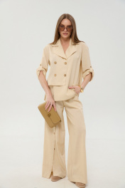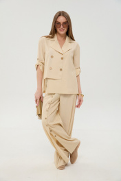 Костюм двухпредметный: состоит из жакета и брюк. Жакет прямого силуэта с имитацией центральной застёжки на пуговицы. Рукав втачной одношовный, длиной три четверти,застегивающийся на пату. Воротник пиджачного типа . Линия низа фигурная, симметричная . Брюки свободного кроя, верхний срез представлен широкой резинкой, с карманами. По центру правой брючины расположена планка с функционирующими петлями и пуговицами.